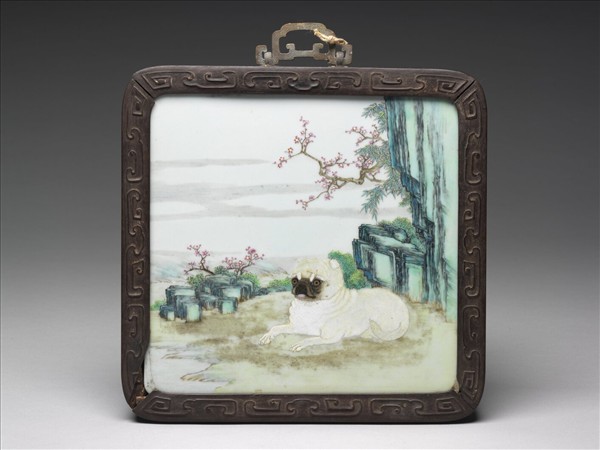 粉彩花卉名犬瓷板