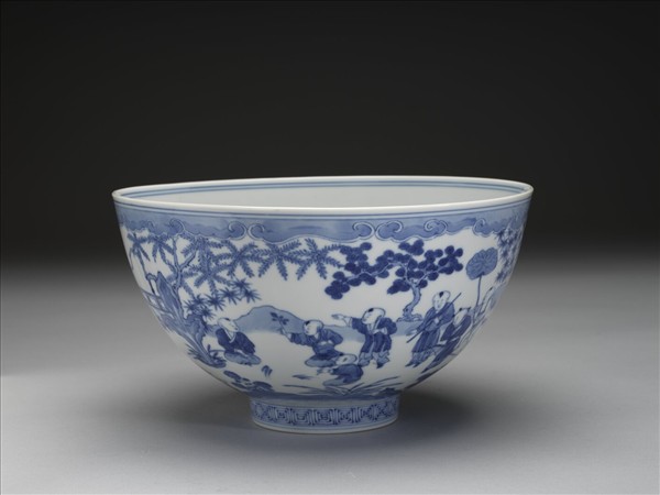 敞口,深壁,矮圈足。薄胎白釉。外壁畫庭園景物,二十孩童或坐或立嬉戲其間,足圈畫回紋一周,口足分飾青線六道。碗內純白,樸素無紋飾。