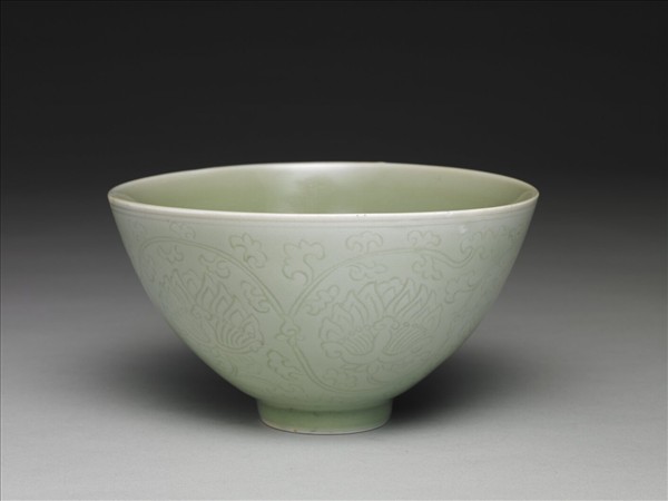 蓮子碗形式,廣口、深壁、尖底、小足。外壁以尖細工具刻花,口緣弦紋,腹部作纏枝番蓮紋,圖案化變形花卉,足端平切露白胎。胎體輕薄,釉色淺而灰白均勻。從胎釉近於宣德器,裝飾圖案則較粗簡。