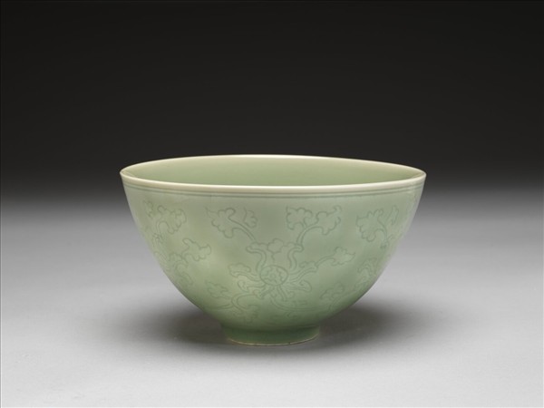 敞口,深壁,矮圈足。胎骨稍厚,通體施滿翠青色釉。以劃花為飾,內壁光素無紋,外壁口沿刻弦紋二道,腹部劃纏枝番蓮六朵。