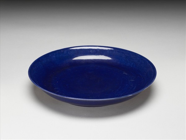 侈口,淺壁弧形,矮圈足。盤心及外壁分劃趕珠雲龍紋五條,底邊劃蓮瓣紋一周。胎質較薄,內外滿施霽青釉,盤底純白。底有青花書「大明嘉靖年製」二行六字楷款,外加雙圈。
