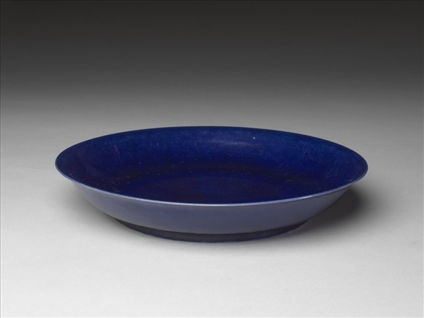 侈口,淺壁弧形,矮圈足。盤心及外壁分劃趕珠雲龍紋五條,底邊劃蓮瓣紋一周。胎質較薄,內外滿施霽青釉,盤底純白。底有青花書「大明嘉靖年製」二行六字楷款,外加雙圈。