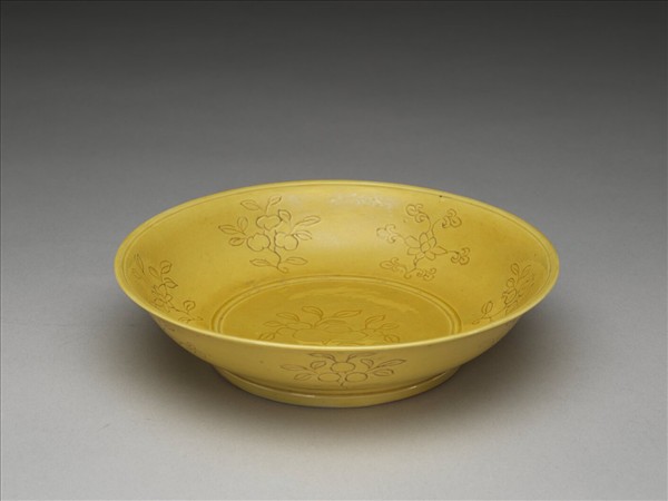 侈口,淺壁,矮圈足。薄胎骨,通體施嬌黃釉。內外壁及盤心刻劃折枝花果共十三枝,口足內外分劃淺線五道。底劃有「大明嘉靖年製」二行六字楷款,外加雙圈。