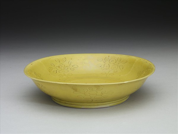 侈口,淺壁,矮圈足。薄胎骨,通體施嬌黃釉。內外壁及盤心刻劃折枝花果共十三枝,口足內外分劃淺線五道。底劃有「大明嘉靖年製」二行六字楷款,外加雙圈。
