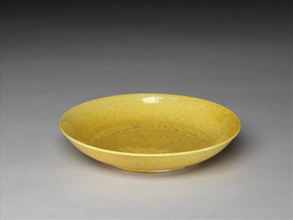 侈口窄唇,淺壁,矮圈足。薄胎骨,器內外壁滿施嬌黃釉,盤底純白,樸素無紋飾。底有青花書「大明嘉靖年製」六字二行楷款,外加雙圈。
