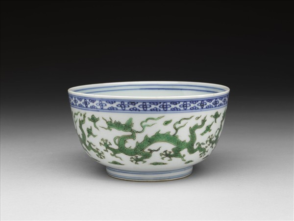 敞口,深壁,矮圈足。碗心及外壁畫綠彩雲龍五條,外面口沿下畫青花四瓣花一周,內外加飾青線十二道。內壁純白樸素無紋飾。底有青花書「大明正德年製」六字二行楷款,外加雙圈。