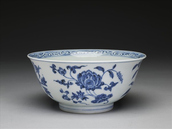侈口窄唇,深壁,矮圈足。薄胎白釉。口唇上畫卷草紋一周,碗心畫石榴一枝。外壁畫牡丹、蓮花等四折枝。口足內外分飾青線七道。內壁純白,樸素無紋飾。