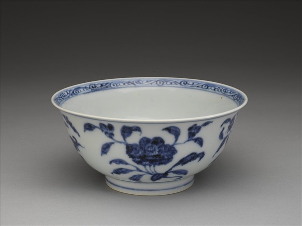 侈口窄唇,深壁,矮圈足。薄胎白釉。口唇上畫卷草紋一周,碗心畫石榴一枝。外壁畫牡丹、蓮花等四折枝。口足內外分飾青線七道。內壁純白,樸素無紋飾。