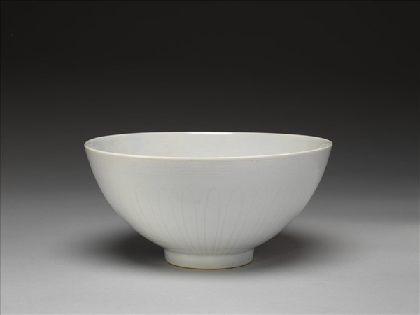 敞口,深壁,尖底,矮圈足。碗內口沿下印花波濤紋一道,周壁印纏枝牡丹、菊花等四季花。外口沿下劃回紋一道,周壁劃蓮瓣紋略凸起。薄胎骨,通體施甜白釉。