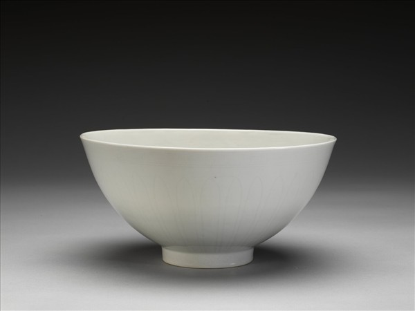敞口,深壁,尖底,矮圈足。碗內口沿下印花波濤紋一道,周壁印纏枝牡丹、菊花等四季花。外口沿下劃回紋一道,周壁劃蓮瓣紋略凸起。薄胎骨,通體施甜白釉。