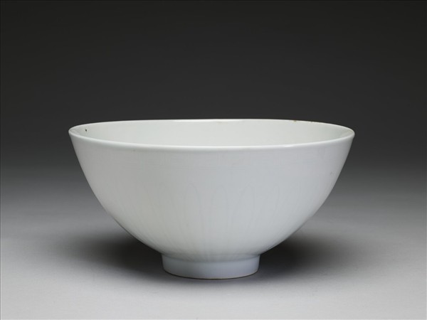 敞口,深壁,尖底,矮圈足。碗內口沿下印花波濤紋一道,周壁印纏枝牡丹、菊花等四季花。外口沿下劃回紋一道,周壁劃蓮瓣紋略凸起。薄胎骨,通體施甜白釉。