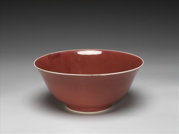侈口窄唇,深壁,矮圈足。胎質較薄,內外滿施深紅釉。外壁描金畫雙雲龍趕珠紋,底邊畫蓮瓣紋一周。描金全部脫落,僅留暗紋痕跡,碗心亦似有紋,糢糊不清。