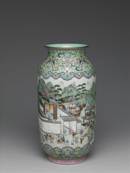 燈籠尊形,腹部白釉,彩畫山水及群嬰龍舟競渡。頸部與底邊為綠釉地,彩畫纏枝番蓮花,加飾「卍」字、雙魚及如意雲紋。圈足畫回紋一周。器內及底均施湖綠色釉,底描紅書「大清乾隆年製」,六字篆款。