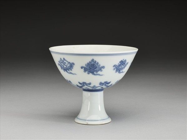 外壁畫朵雲托八寶,底邊飾如意雲頭紋一周。上下共畫青線三道。圈足中空,內青花楷書「大清雍正年製」款。