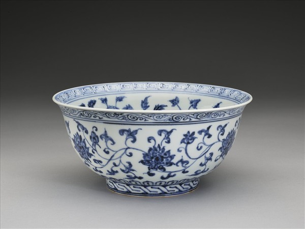 侈口窄唇,深壁,矮圈足。薄胎白釉。口唇上畫回紋一周,內壁畫轉枝牡丹、菊花等六朵,碗心畫牡丹一枝。外口沿下畫卷草紋,周壁畫轉枝番蓮六朵,底邊畫蓮瓣紋,足圈畫回紋,口足內外分飾青線十二道。