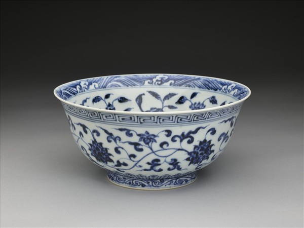 侈口窄唇,深壁,矮圈足。口唇上畫波濤紋,內壁畫纏枝牡丹、菊花等五朵,碗心畫番蓮一枝。外口沿下畫回紋,周壁畫纏枝番蓮五朵,底邊畫蓮瓣紋,足圈畫卷草紋。口足內外分飾青線十道。