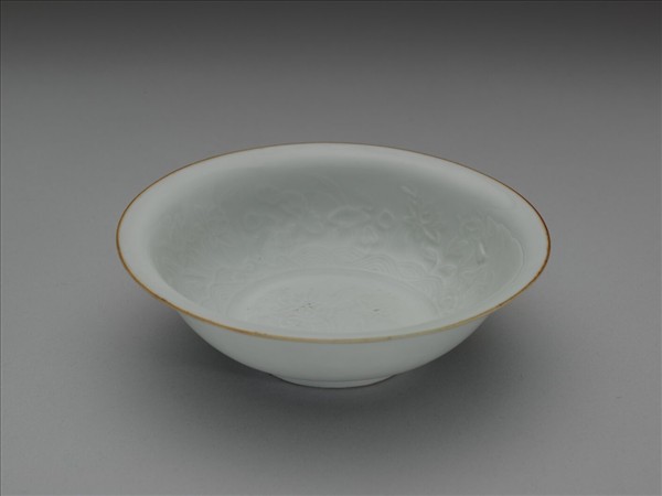 侈口窄唇,深壁、矮圈足。內壁與底心滿印蓮塘紋,加飾鷺鷥紋,外壁樸素無紋飾。胎骨較薄,釉色青中泛白。