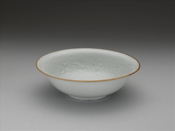 侈口窄唇,深壁、矮圈足。內壁與底心滿印蓮塘紋,加飾鷺鷥紋,外壁樸素無紋飾。胎骨較薄,釉色青中泛白。