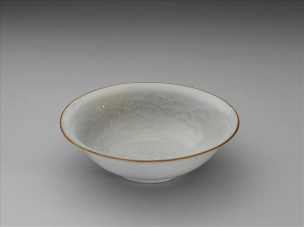 侈口窄唇,深壁、矮圈足。內壁與底心滿印蓮塘紋,加飾鷺鷥紋,外壁樸素無紋飾。胎骨較薄,釉色青中泛白。