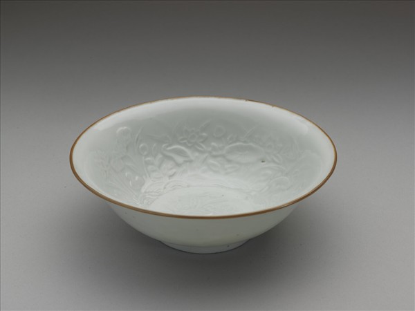 侈口窄唇,深壁、矮圈足。內壁與底心滿印蓮塘紋,加飾鷺鷥紋,外壁樸素無紋飾。胎骨較薄,釉色青中泛白。