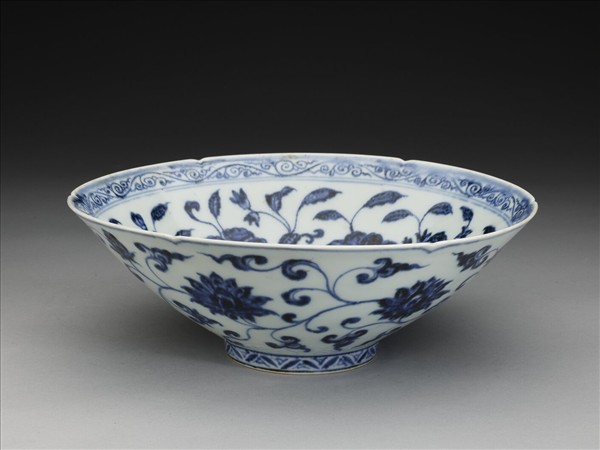 六瓣葵花形,深壁,矮圈足。薄胎白釉。器內口沿下畫卷草紋一道,內壁畫纏枝石榴花六朵,碗心畫荔枝一折枝。外壁畫纏枝番蓮六朵,足圈畫花瓣紋一周。口足內外分飾青線十道。