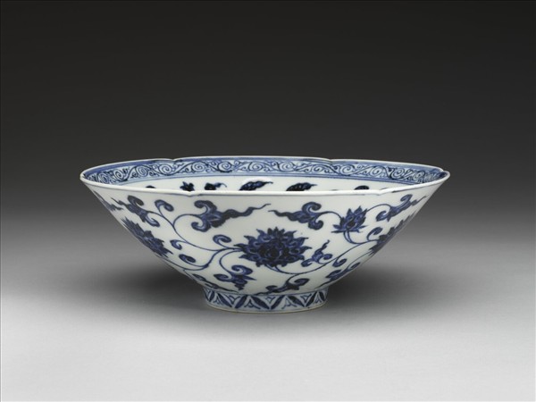 六瓣葵花形,深壁,矮圈足。薄胎白釉。器內口沿下畫卷草紋一道,內壁畫纏枝石榴花六朵,碗心畫荔枝一折枝。外壁畫纏枝番蓮六朵,足圈畫花瓣紋一周。口足內外分飾青線十道。