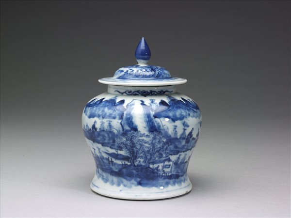 青花山水人物圖蓋罐