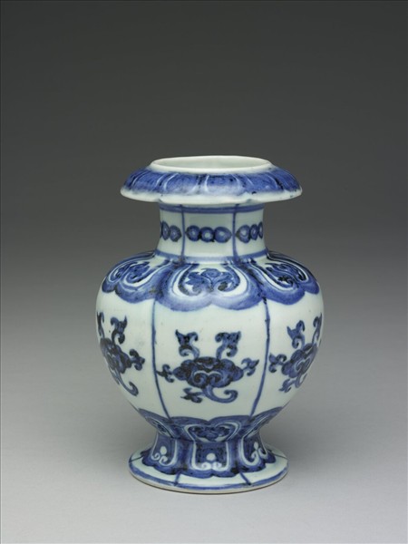 斂口,折沿六瓣葵花邊,短頸,豐肩,碩腹,高足外撇。器身頸、腹、圈足各以青線畫六瓣花形,與沿面對稱。頸上各區內繪雙圈三連環紋,沿面、肩、底邊、圈足則各繪仰覆蓮瓣紋一周,腹部主紋為六折枝靈芝紋。全器胎骨厚重,足底露胎,胎質潔白細膩,間有鐵質斑點,胎釉一線呈淺黃色。青花濃重,多處呈鐵褐結晶疵斑,聚釉處白釉泛青。
