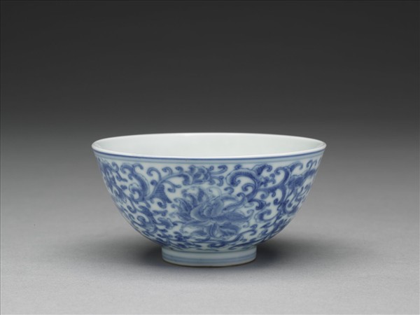 圓口微侈,深壁,矮圈足。薄胎白釉,外面畫纏枝花卉四朵,口、足分飾青線五道。器內純白,樸素無紋飾。底有青花書「大清雍正年製」六楷字款,外加雙方圈。
