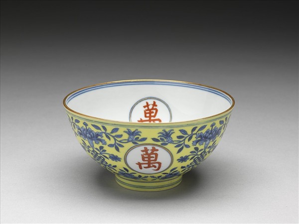 黃地青花描紅萬壽無疆紋碗