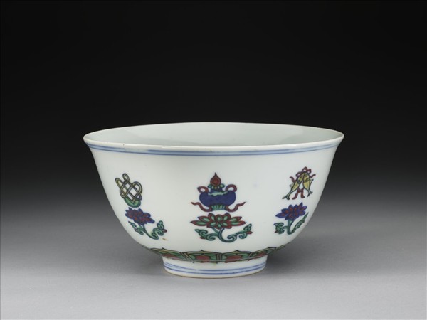 侈口窄唇,深壁,矮圈足。薄胎白釉,外壁彩畫番蓮花八折枝,上托八寶紋,底邊彩畫蓮瓣紋一周,口足各畫青線二道。碗心彩畫靈芝一枝,加飾雙圈,周壁純白無紋飾。底有青花書「大明萬曆年製」六字二行楷款,外加雙圈。