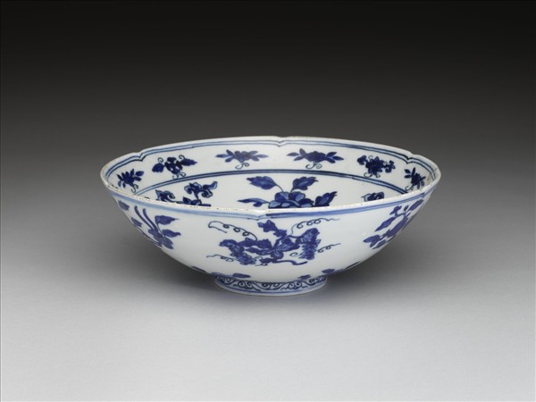六瓣葵花形口,深壁,矮圈足。碗內口沿下兩道弦紋間畫各種花卉十二朵,內壁畫四季花卉六枝,底心三圈弦紋內畫桃實一枝。外壁口沿下弦紋兩道,器身畫折枝花、果分上下二層各六枝。足壁上下圈畫弦紋兩道,內飾卷草紋一周。底有青花書「大明萬曆年製」六字二行楷款,外加雙圈。