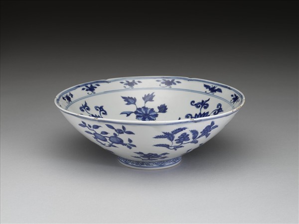 六瓣葵花形口,深壁,矮圈足。碗內口沿下兩道弦紋間畫各種花卉十二朵,內壁畫四季花卉六枝,底心三圈弦紋內畫桃實一枝。外壁口沿下弦紋兩道,器身畫折枝花、果分上下二層各六枝。足壁上下圈畫弦紋兩道,內飾卷草紋一周。底有青花書「大明萬曆年製」六字二行楷款,外加雙圈。