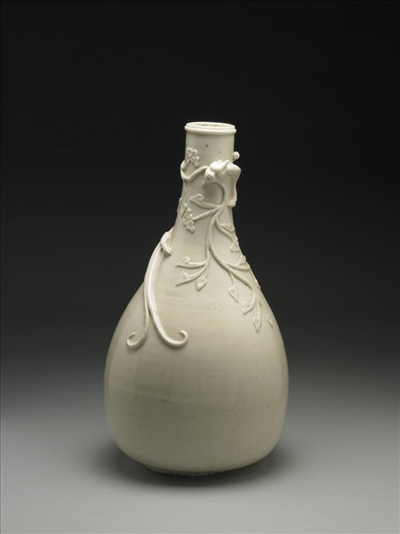 瓶,小口,瘦長頸,頸以下漸廣,腹作橢圓形,圈足。全器施白釉,色澤光潤,乳白如凝脂。頸部貼花螭紋及花葉紋,螭尾長而分兩歧。貼花即用印模印出紋飾後貼在器物上。胎質堅緻。