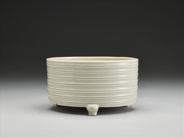 器呈短筒形,直口、深直壁。三蹲式獸足,特別短而矮。器心窪而器底隆起。外壁飾弦紋,雙線合成一組,共有七組。胎厚重,釉色牙白。器底的內外均無釉露胎。