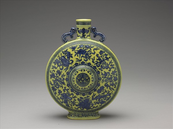 短頸,腹部扁圓,橢圓圈足,頸腹飾二螭形耳。全器黃釉地,青花圖案。腹部畫「暗八仙紋」,中心凸出書壽字,周飾回紋、如意雲紋。腹部兩側畫番蓮花,頸上繪回紋、蝙蝠口銜卍字,足圈飾雲紋。底青花書「大清乾隆年製」六字篆款。