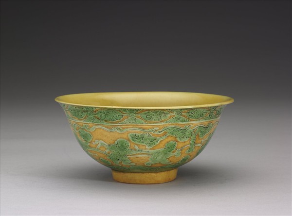 黃地綠彩嬰戲圖碗