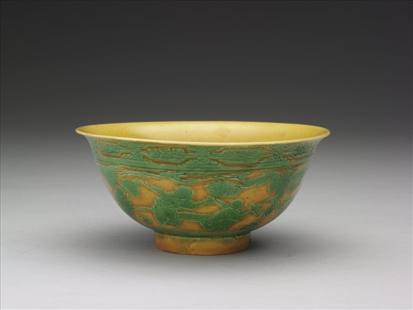 侈口,矮圈足。黃色釉地。外壁刻劃孩童八人,姿態各異。背景綴以松樹、雲朵。上下間飾雲紋兩圈,內壁黃釉無紋飾。底中心微凸,青花書「大明嘉靖年製」六字楷款。