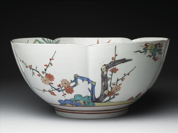 碗呈五瓣花形,內外壁均施乳白色釉,釉層較薄。釉上加彩繪飾山石花木,碗心則有雙鳳追逐,紋飾之外還保留大量空白,散發含蓄優雅的氣質,是伊萬里瓷器中的「柿右衛門」樣式。器外底心書雙方框「福」字銘,書體近渦旋狀,也稱之為「渦福」銘。