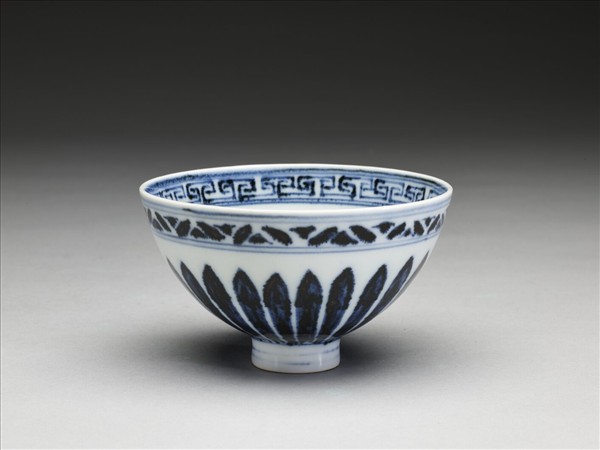 敞口,深壁上豐下斂,尖底,矮圈足,俗稱「蓮子碗」。薄胎白釉。器內口沿下畫回紋一道,周壁畫桃形勾連圖案,底心畫六瓣花一朵,上飾連卷圖案一周。外口沿下畫花瓣圖案一道,周壁畫蓮瓣紋。花紋間加飾青線十四道。