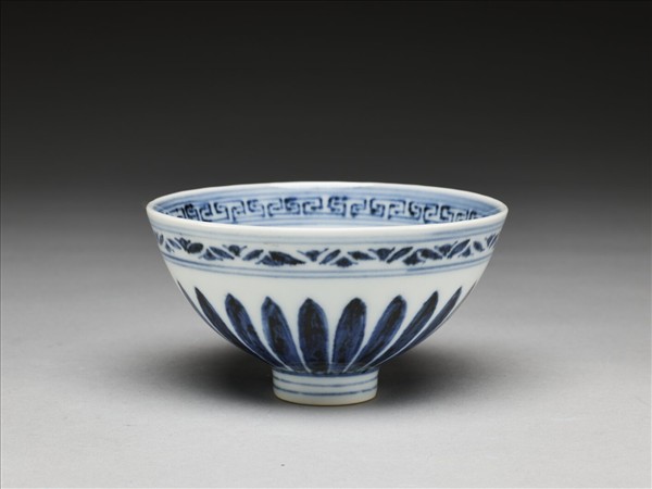 敞口,深壁上豐下斂,尖底,矮圈足,俗稱「蓮子碗」。薄胎白釉。器內口沿下畫回紋一道,周壁畫桃形勾連圖案,底心畫六瓣花一朵,上飾連卷圖案一周。外口沿下畫花瓣圖案一道,周壁畫蓮瓣紋。花紋間加飾青線十四道。