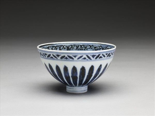 敞口,深壁上豐下斂,尖底,矮圈足,俗稱「蓮子碗」。薄胎白釉。器內口沿下畫回紋一道,周壁畫桃形勾連圖案,底心畫六瓣花一朵,上飾連卷圖案一周。外口沿下畫花瓣圖案一道,周壁畫蓮瓣紋。花紋間加飾青線十四道。