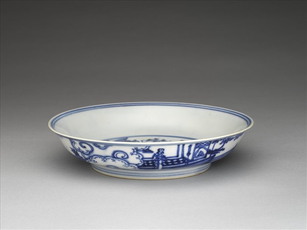 侈口窄唇,淺壁,矮圈足。薄胎白釉。盤心畫松竹梅三友圖,外壁畫庭園仕女焚香賞月圖景,口足內外分飾青線十道,內壁純白無紋飾。