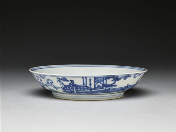 侈口窄唇,淺壁,矮圈足。薄胎白釉。盤心畫松竹梅三友圖,外壁畫庭園仕女焚香賞月圖景,口足內外分飾青線十道,內壁純白無紋飾。