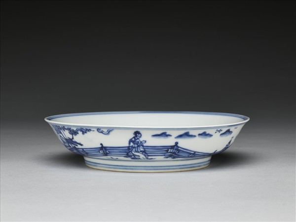 侈口窄唇,淺壁,矮圈足。薄胎白釉。盤心畫松竹梅三友圖,外壁畫庭園仕女焚香賞月圖景,口足內外分飾青線十道,內壁純白無紋飾。