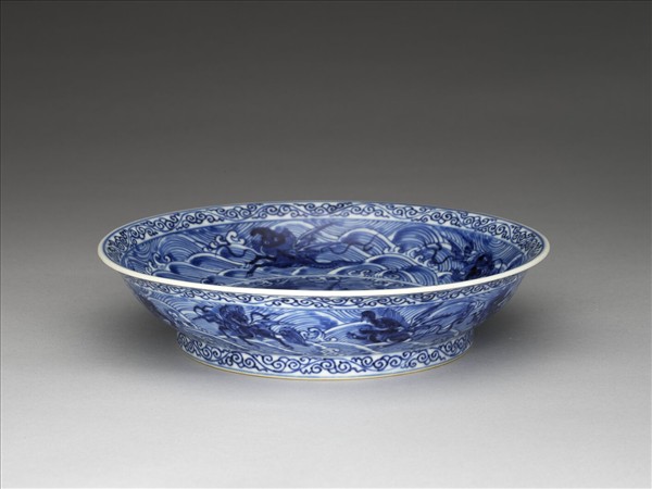 侈口窄唇,深壁,矮圈足。盤內畫海獸六隻,外壁畫九隻,隙地滿畫波濤紋。口唇內外及足各畫卷草紋一周。花紋間加飾青線八道。