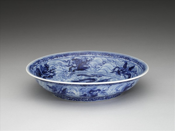 侈口窄唇,深壁,矮圈足。盤內畫海獸六隻,外壁畫九隻,隙地滿畫波濤紋。口唇內外及足各畫卷草紋一周。花紋間加飾青線八道。