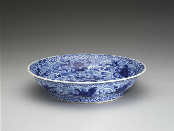 侈口窄唇,深壁,矮圈足。盤內畫海獸六隻,外壁畫九隻,隙地滿畫波濤紋。口唇內外及足各畫卷草紋一周。花紋間加飾青線八道。