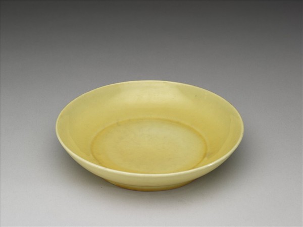 黃釉盤,侈口,淺弧壁,內底微凹,矮圈足,足底平切露白胎。底露白釉,色澤泛青,外底心陰刻「大明宣德年製」二行雙圈楷書款。本展件原高溫燒成白瓷,再罩氧化鐵為色釉,以低溫二次燒成黃釉。宣德時期的黃釉以澆釉法施釉,釉表多有不勻處,向有「澆黃」之稱;黃釉明亮嬌嫩,亦有「嬌黃」的美名。黃釉表面多有刮痕,留下當時使用的痕跡。黄釉瓷是明代最具皇室氣質的一朵奇葩,據明洪武二十四年(1391)《明史‧輿服制》規定:「官吏衣服、帳幔,不許用玄、黄、紫三色」。正統十一年(1446)《明英宗實錄》再申明:「禁江西饒州府私造黄、紫、红、绿、青、蓝、白地青花瓷」,違者凌遲處死,丁男充軍邊衛等嚴令。《大明會典》為明代的法律要典,其中在〈器用〉一章敘述:「圜丘青色,方丘黃色,日壇赤色,月壇白色」,亦即祭天、地、日、月各用不同色彩的器皿,黃釉器即作為祭地之用。由此可觀察到黃釉器的特殊意義。
