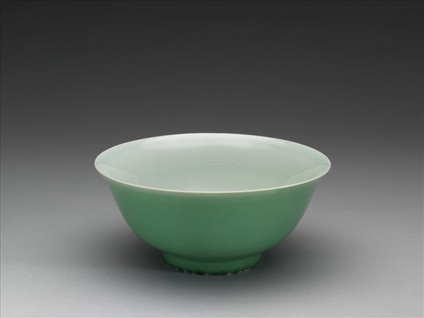 撇口,弧壁,矮圈足。碗心略凹,中心點凸出。器內及底均施白釉,內壁印飾雙龍趕珠,隙間加飾雲紋,內壁口沿積釉泛青。外壁白釉上飾以低溫綠釉,呈嫩鮮綠色,口沿「燈草白」一周,足圈積釉不齊,呈色深綠,並露出不規則白邊一道。釉內密佈細小氣泡,邊緣釉厚處大小氣泡疏朗。胎骨均勻,圈足露胎,細白堅緻。器底白釉上淺劃「大明宣德年製」二行六字楷款,外加雙圈。